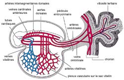 Illustration 4: Diagramme du système cardio-vasculaire rudimentaire d'un embryon au stade de la alaqah. L'apparence externe de l'embryon et de ses sacs est similaire à celle d'un caillot de sang; cela est dû à la présence de grandes quantités de sang dans l'embryon. (The Developing Human [L'humain en développement], Moore, 5e édition., p. 65.)