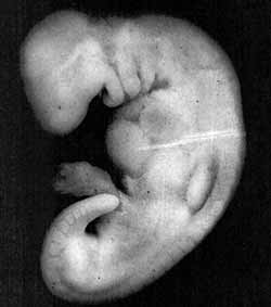 Illustration 5: Photographie d'un embryon au stade appelé moudghah (âgé de 28 jours). L'embryon, à ce stade, prend l'apparence d'une substance mâchée à cause des somites situés sur le dos qui ressemblent à des traces de dents dans une substance mâchée. La grandeur réelle de l'embryon est de 4 mm. (The Developing Human [L'humain en développement], Moore et Persaud, 5e édition., p. 82, du Professeur Hideo Nishimura de l'Université de Kyoto, à Kyoto (Japon).)