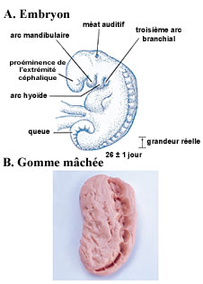 A) Dessin d'un embryon au stade de la moudghah. Nous pouvons voir, sur le dos de l'embryon, les somites qui ressemblent à des traces de dents. (The Developing Human [L'humain en développement], Moore et Persaud, 5e édition., p. 79.)