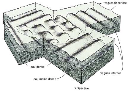 Les vagues internes recouvrent les eaux profondes des mers et océans parce que les eaux profondes ont une densité plus élevée que celle des eaux au-dessus d'elles. Les vagues internes se comportent de la même façon que les vagues de surface. Tout comme les vagues de surface, elles peuvent aussi déferler. Les vagues internes ne peuvent être perçues par l'œil humain; c'est en étudiant les variations de température ou de salinité à un endroit déterminé que l'on arrive à les détecter.24