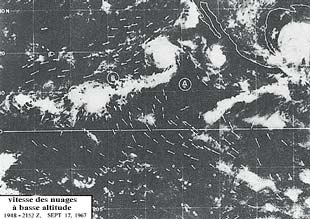 Illustration 17: Photo satellite montrant les nuages se déplaçant vers les aires de convergence B, C, et D. Les flèches indiquent les directions du vent. (The Use of Satellite Pictures in Weather Analysis and Forecasting [L'utilisation des images satellites dans l'analyse et les prévisions météorologiques], Anderson et al., p. 188.)