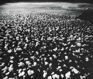 Illustration 18: Petits fragments de nuages (cumulus) se dirigeant vers une zone de convergence près de l'horizon, où l'on aperçoit un gros cumulo-nimbus. (Clouds and Storms [Les nuages et les tempêtes], Ludlam, cliché 7.4.)