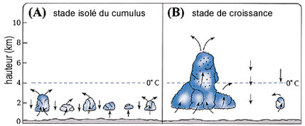 3) Le nuage se développe en hauteur: Lorsque les petits nuages se rassemblent, les courants d'air ascendants augmentent à l'intérieur du gros nuage nouvellement formé. Les courants d'air ascendants qui sont situés près du centre du nuage sont plus forts que ceux situés près des bords26.
