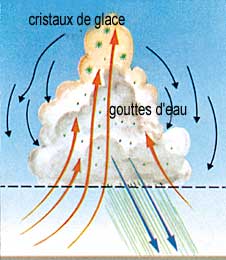 Ces courants d'air ascendants provoquent le développement en hauteur du nuage, formant une structure en forme d'enclume (voir illustrations 19 (B), 20, et 21). Ce développement en hauteur fait en sorte que le nuage s'étend jusqu'à des régions plus froides de l'atmosphère, et c'est là que des gouttes d'eau et des grêlons se forment et augmentent de volume. Lorsque ces gouttes d'eau et ces grêlons deviennent trop lourds pour être soutenus par les courants d'air ascendants, ils commencent à tomber du nuage sous forme de pluie et de grêle.27